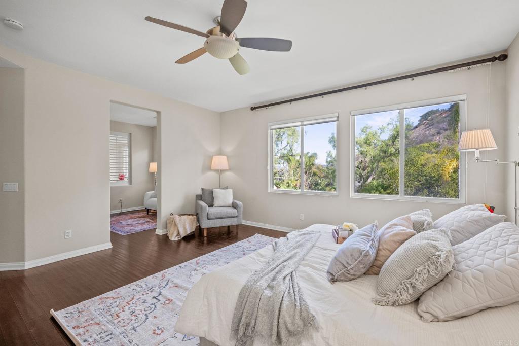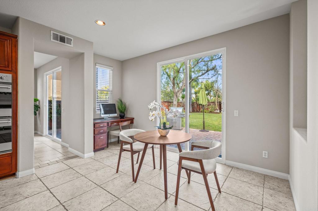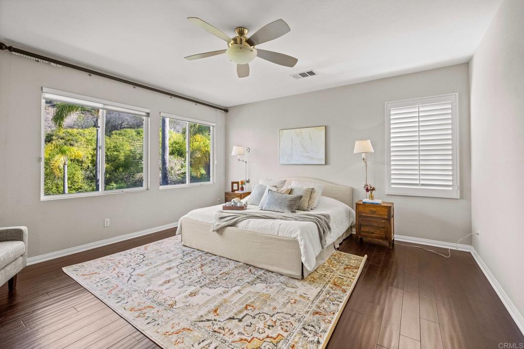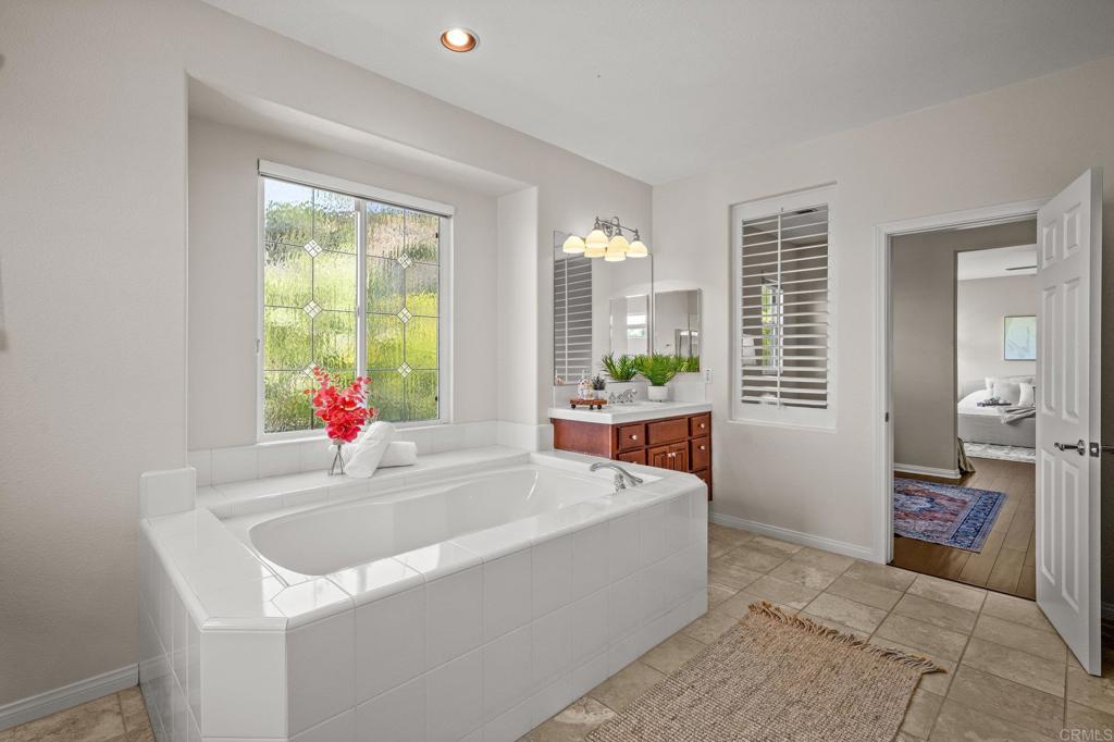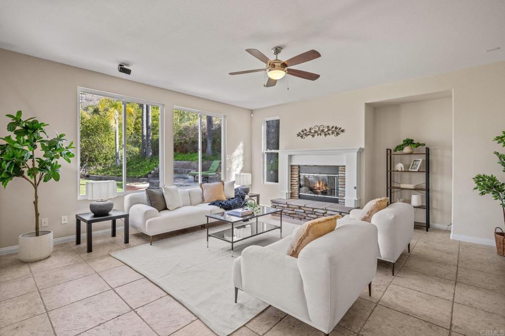 Welcome to this well maintained home in the highly sought-after Rancho Dorado community of San Marcos known for its charming streets, peaceful ambiance, and close-knit feel. From the moment you step inside, you'll notice how thoughtfully this floor plan has been designed to bring comfort, connection, and effortless living together. The expansive family room is truly the heart of the home, featuring a dreamy gas fireplace perfect for cozy evenings, and large picture windows that flood the space with natural light while framing serene views of the backyard. A highly desirable downstairs bedroom with a full bath offers flexibility that is ideal for guests, multigenerational living, or a quiet home office. The spacious kitchen complete with Viking Appliances, a generous center island, granite countertops, a walk-in pantry, and even a built-in desk area just off the breakfast nook perfect for homework, planning, or everyday organization. Upstairs you'll find a welcoming second level with room for everyone. Two bedrooms share a convenient Jack-and-Jill bathroom. The large upstairs laundry room has its own sink, storage, and built-in cabinetry--makes laundry days an absolute breeze. The primary suite feels like a private retreat, offering its own sitting area, dual walk-in closets, dual vanities, and a centered soaking tub that invites you to unwind. Throughout the home, custom white plantain shutters add timeless elegance and an elevated, cohesive feel. The large backyard is just as inviting, offering a pool-sized space with lush grass area, beautiful landscaping, and a the paved patio is perfect for dining al fresco, entertaining, or simply enjoying the Southern California sun. Home has solar Solar and 3 car tandem garage.